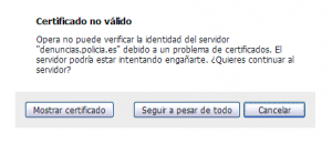 A veces, cuando accedemos a la página la Administración Pública o a uno de sus servicios electrónicos, nos podemos encontrar con ventanas emergentes o alertas de seguridad que pueden tener el siguiente aviso: